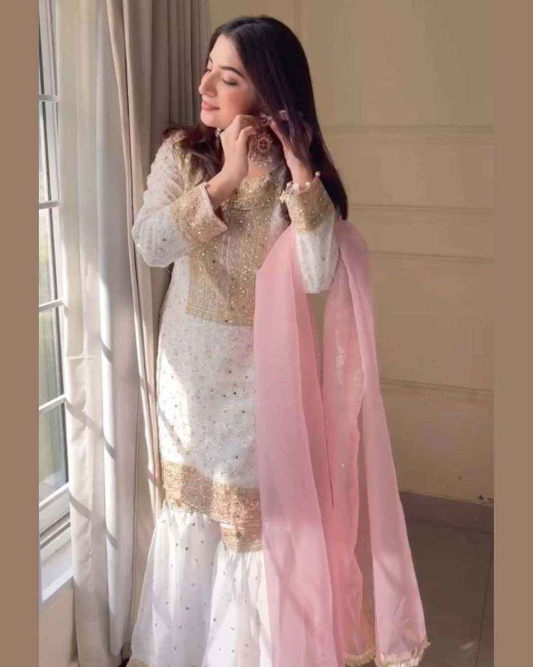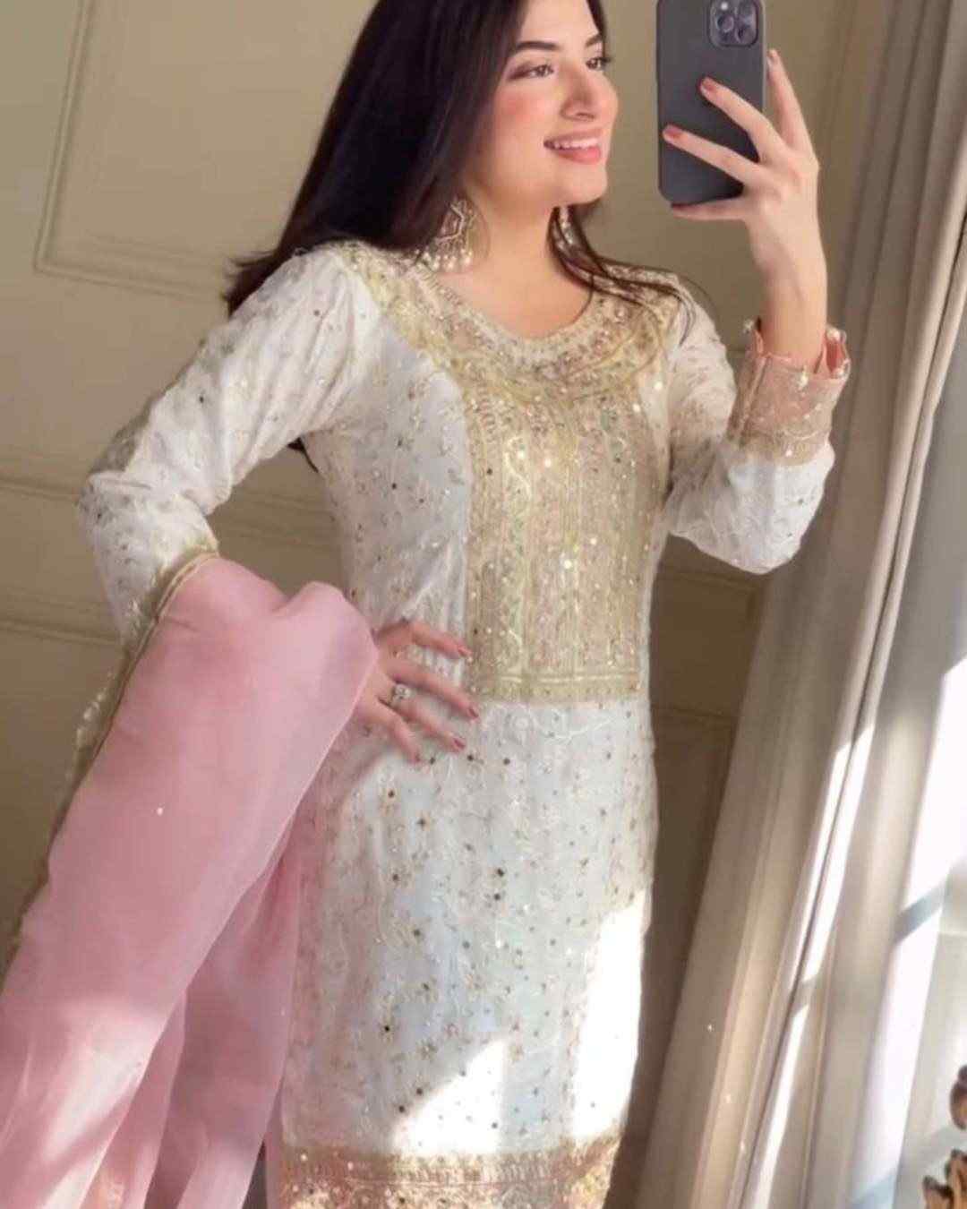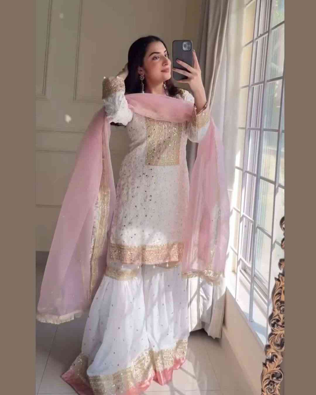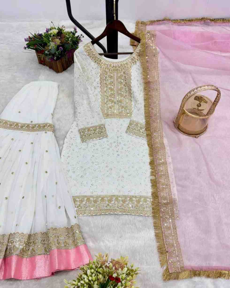 Fabric Type | Top : Heavy Faux Georgette With Heavy Embroidery-Sequence And Thread Work (only Front Side Work ) , Inner : Heavy Micro Cotton , Length:38 inch Sharar : -Heavy Faux Georgette With Heavy Embroidery Sequence And Thread Work With Tapeta belt Border , Inner : Heavy Micro Cotton , Length:40-42 inch Dupatta :Heavy Orgaza Silk With Heavy Embroidery-Sequence Lace And Readymade Lace Border , Length ; 2.10 mtr , |