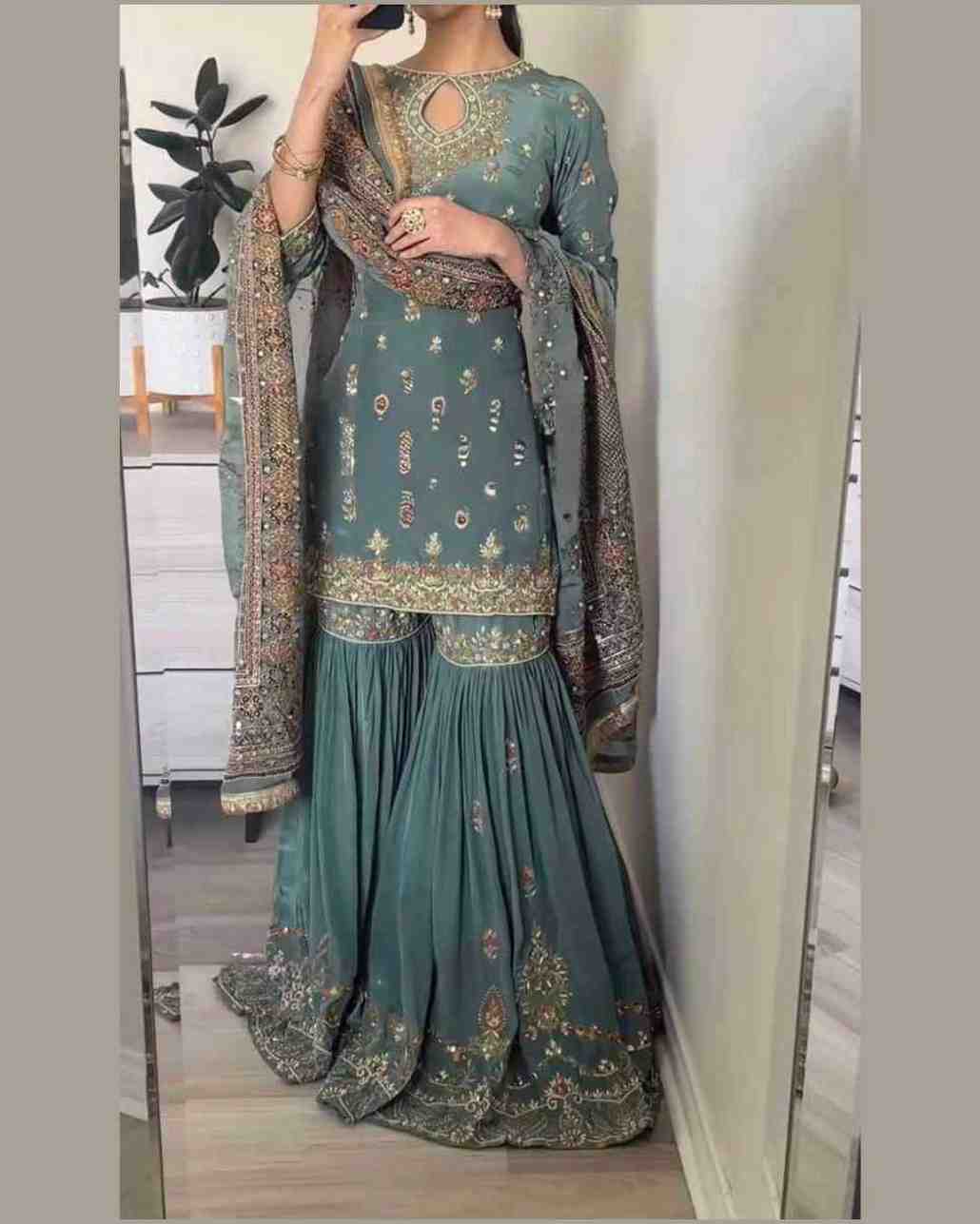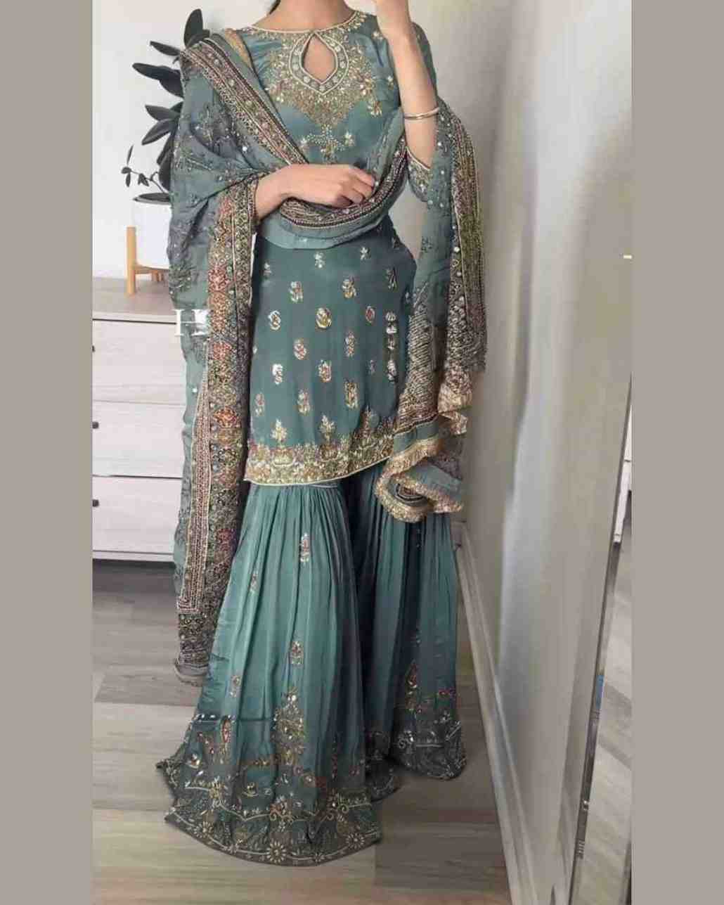 Fabric Type | Kurti :Heavy Faux Georgette With 5mm Embroidery Sequence Work With Full Sleeve ,Inner : Heavy Micro Cotton , Length : 38-39 Inch Shrara : Heavy Faux Georgette With 5mm Embroidery Sequence With Fully Flair ,Inner : Heavy Micro Cotton, Length :40-41 inch Dupatta Heavy Georgette With Rivet Moti Work and Embroidery Sequence Work And Lace Border ,Length : 2.10Mtr. |