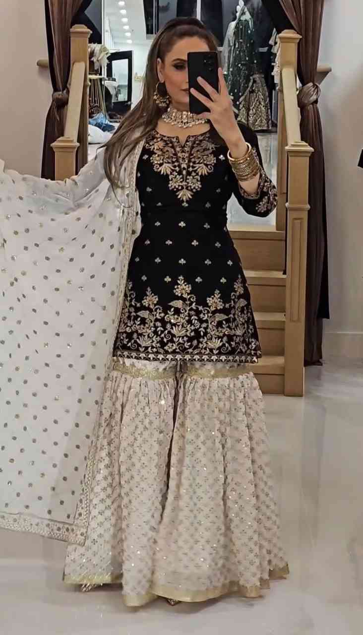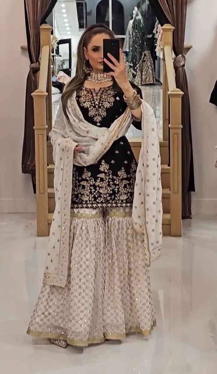 Fabric Type | Kurti ::Heavy Faux Georgette With 5mm Embroidery Sequence Work With Full Sleeve ,Inner : Heavy Micro Cotton , Length : 38-39 Inch Shrarara ::Heavy Faux Georgette With Full Heavy 5mm Embroidery Sequence With Fully Flair ,Inner : Heavy Micro Cotton ,Length :40-41 inch Dupatta : :Heavy Georgette With Embroidery Sequence Work And Lace Border ,Length : 2.10Mtr. |