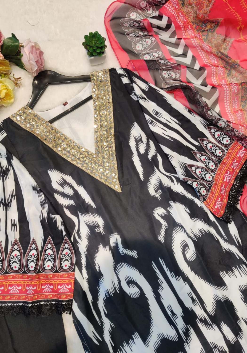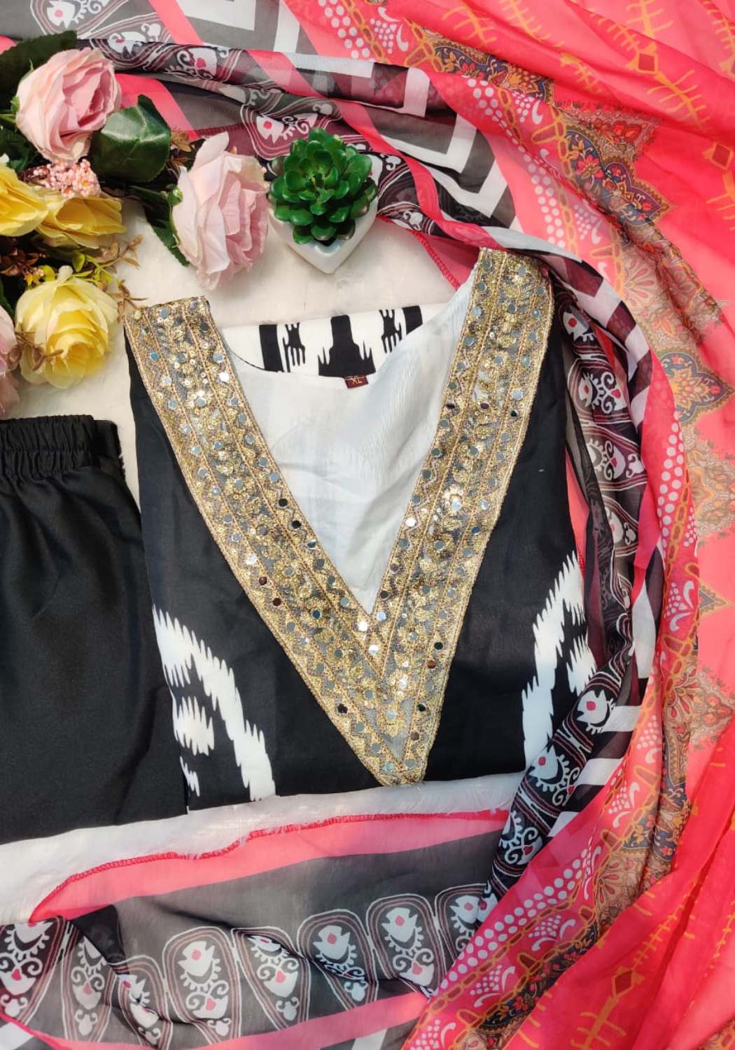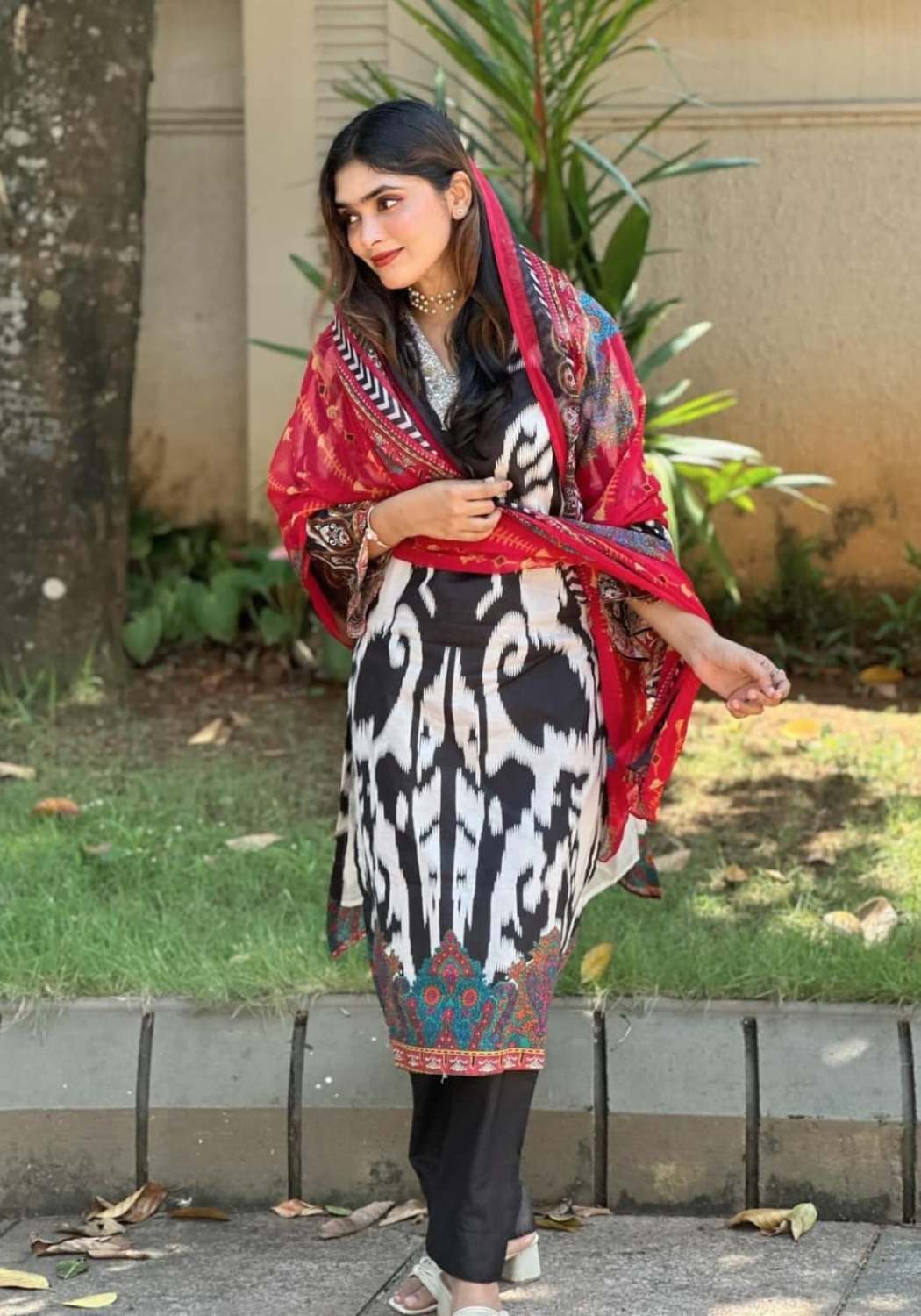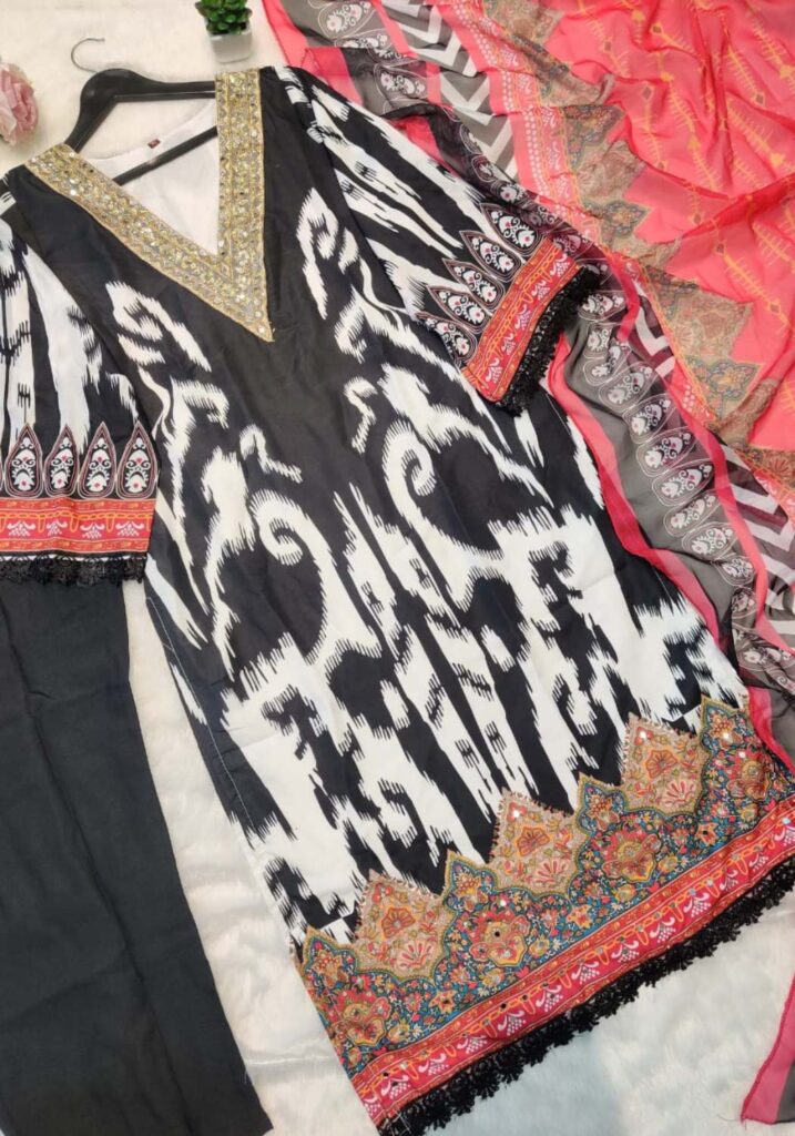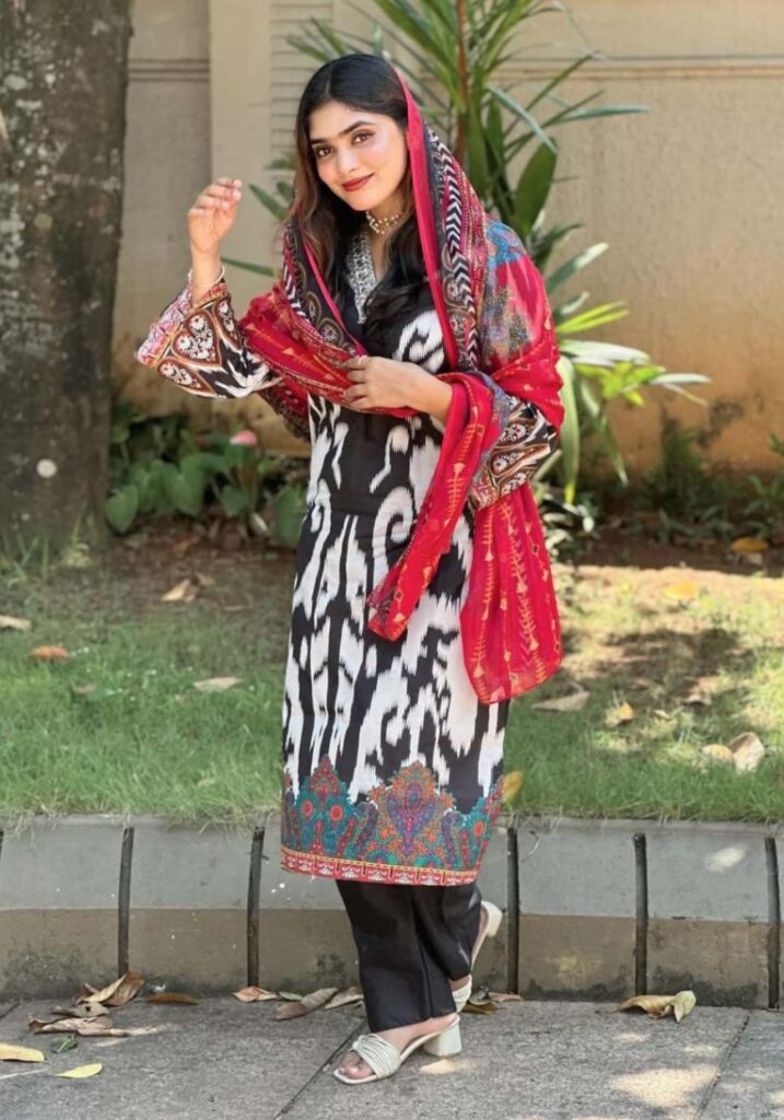 Fabric Type | Top:Heavy Muslin Cotton With Digital Print With Embroidery Work Real Mirror Handwork With Full Sleeves |Top Inner: Heavy Cotton| Top Length: 45-46 Inch | Bottom: Heavy Micro Cotton Pent |Bottom length:40-41 Inch | Dupatta: Heavy Tabby Silk With Digital Print Work | Type: Fully Stitched |