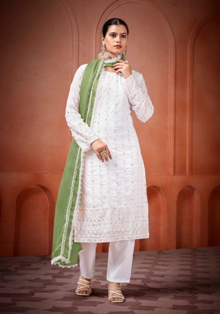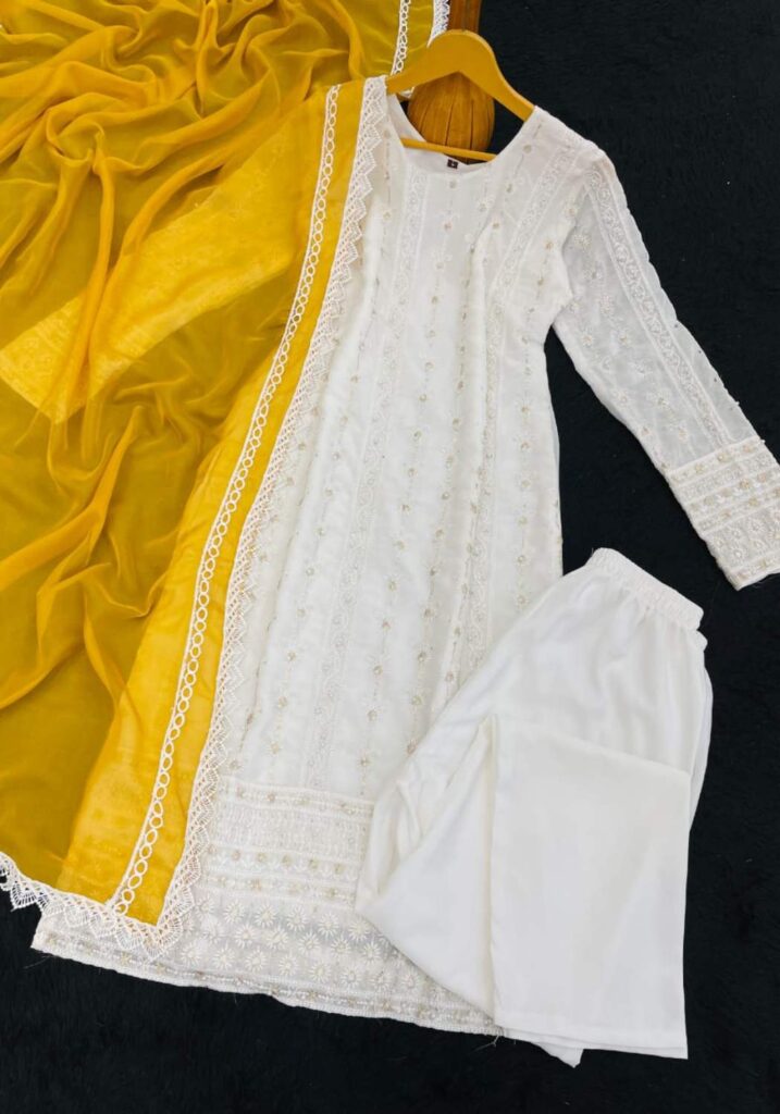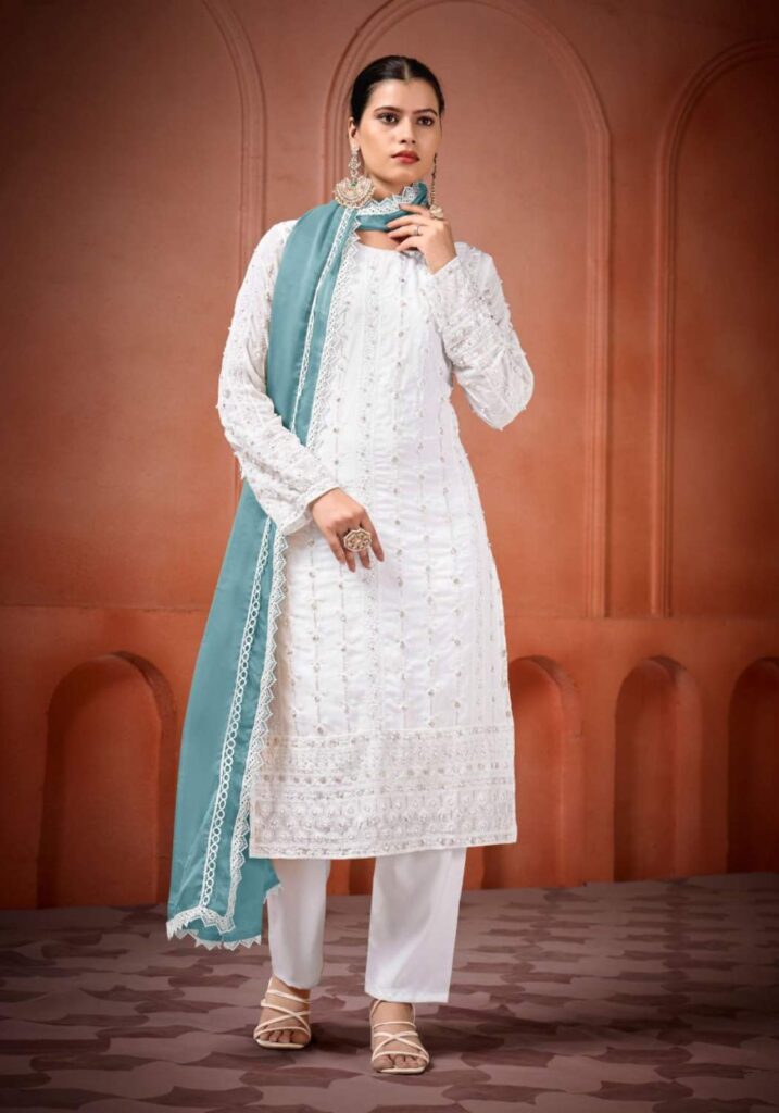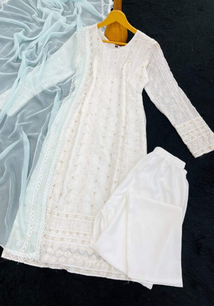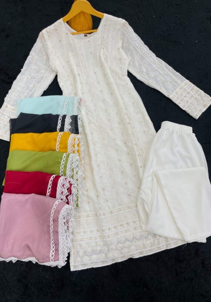 Fabric Type | Top: Heavy Georgette With Heavy Embroidery Sequence Work With Moti Work.|Top Inner: Heavy Micro Cotton| Top Length: 46 Inch | Bottom: Heavy Micro Cotton |Dupatta: Heavy Tabby Silk With 4Side Lec.| Type: Fully Stitched |