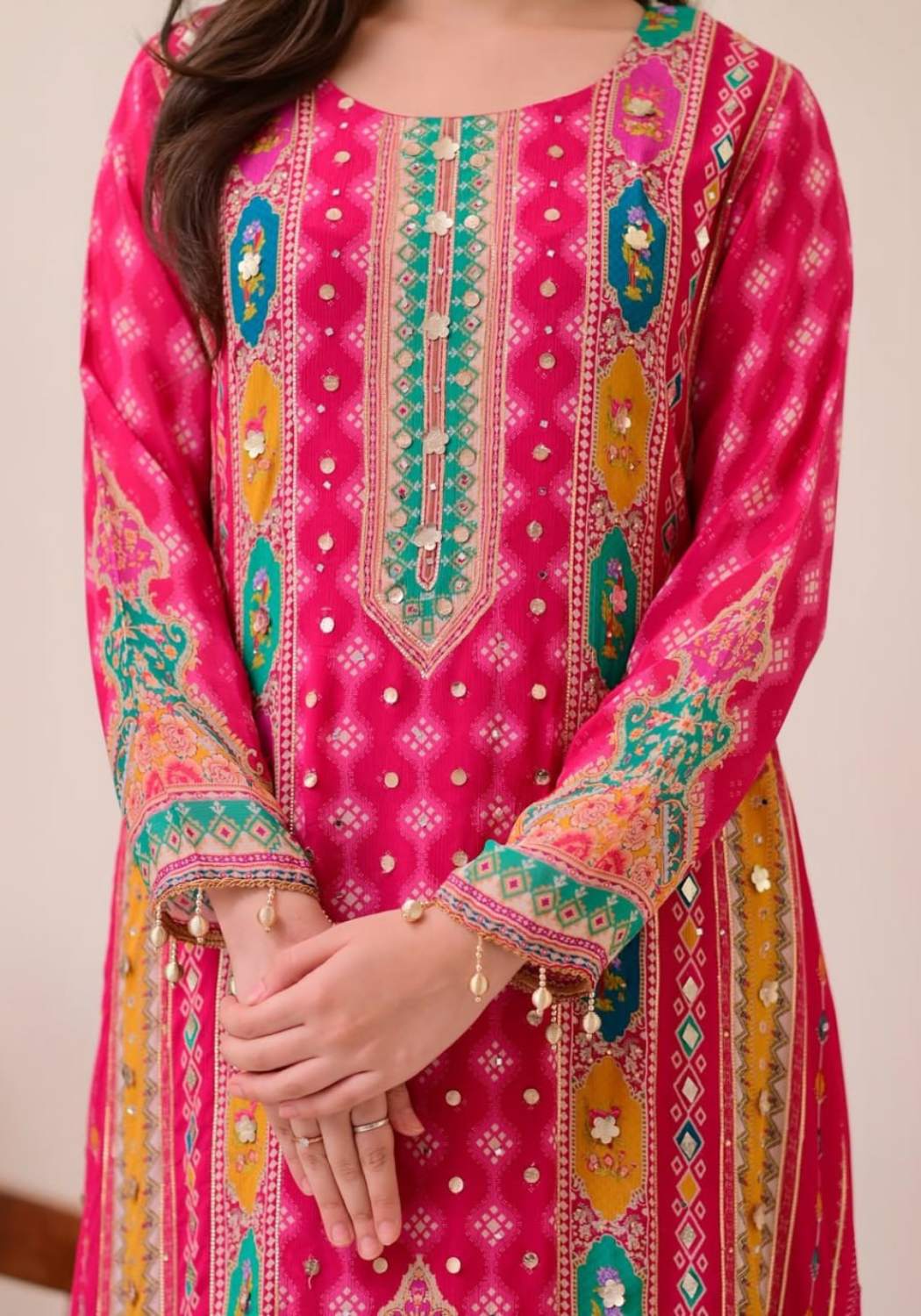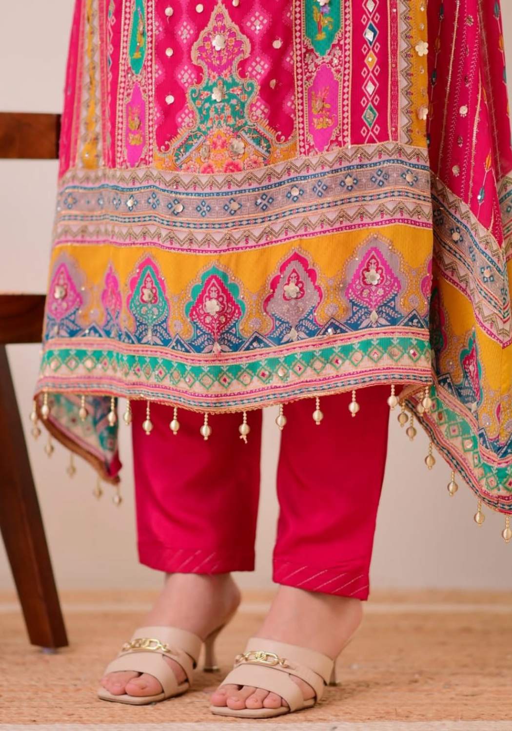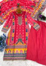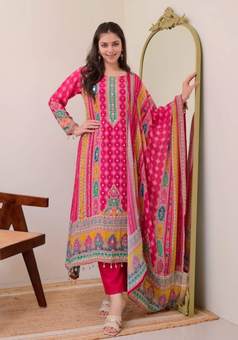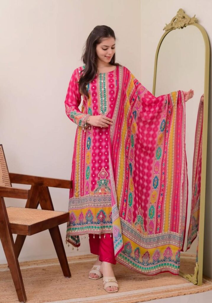 Fabric Type | Top: Heavy Muslin Cotton With Digital Print With Real Mirror Handwork With Full Sleeve. , Inner: Heavy Micro Cotton , Length: 45-46 Inch Bottom: Heavy Micro Cotton With Elastic , Length: 40-41 inch Dupatta: Heavy Muslin silk Cotton With Digital Print Work , Type: Fully Stitched |