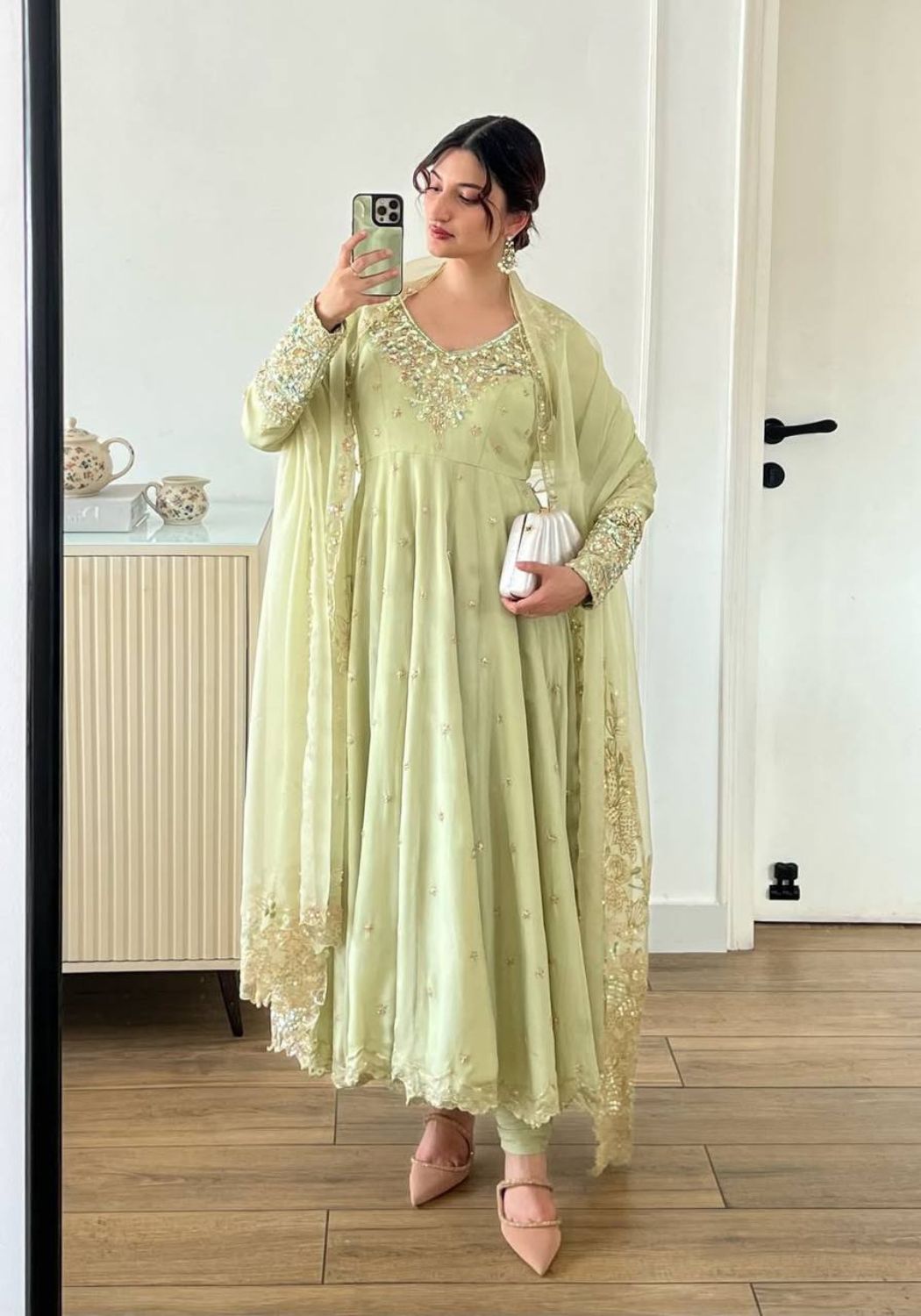 Fabric Type | Gown: Heavy Georgette With Full Heavy Embroidery Rembo Sequence Work With Moti Work with Sleeve With Micro cotton Inner, Length:51-52 Inches , Flair:3 Meter Bottom : Heavy Micro Cotton ( Full Stitched ) Dupatta : Heavy Georgette With Heavy Embroidery Rembo Sequence Work |